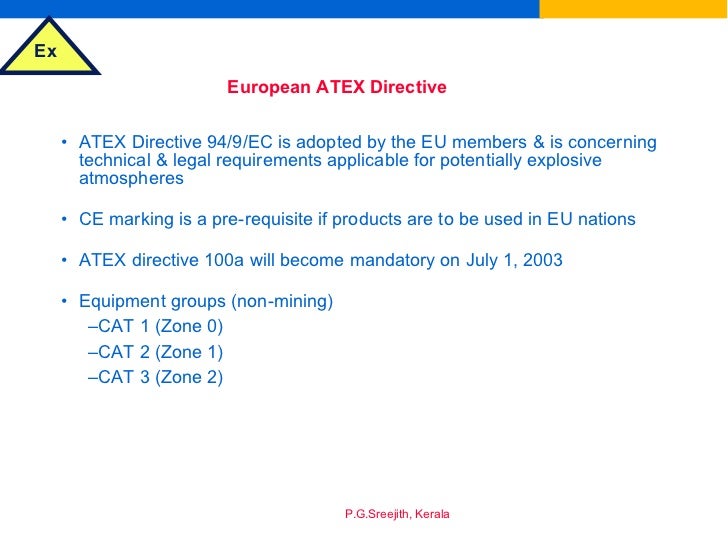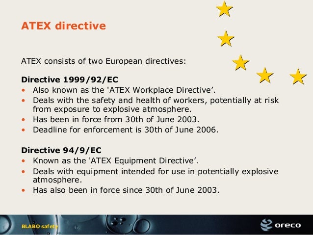 ATEX Directive 94/9/EC all products placed on the market in the European Union have to conform to Directive 94/9/EC. Already installed equipment need, however, not be replaced by equipment conforming to the ATEX directive. Creation of Directive 94/9/EC (also called ATEX or ATEX 100A) in ... Read Content